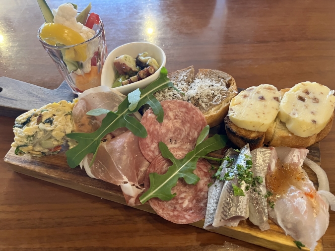 この日は、(前列右から)天然鯛のぷりぷりカルパッチョ、イワシのマリネ、イタリア産ハム、イタリアンオムレツ、(後列右から)いちじくバターのブルスケッタ、鶏レバーのパテ、関門タコとアボカドのジェノベーゼ、自家製ピクルス(きゅうり、人参、カリフラワー、セロリ、パプリカ)と豪華なラインナップ。