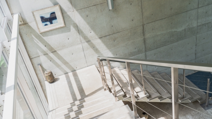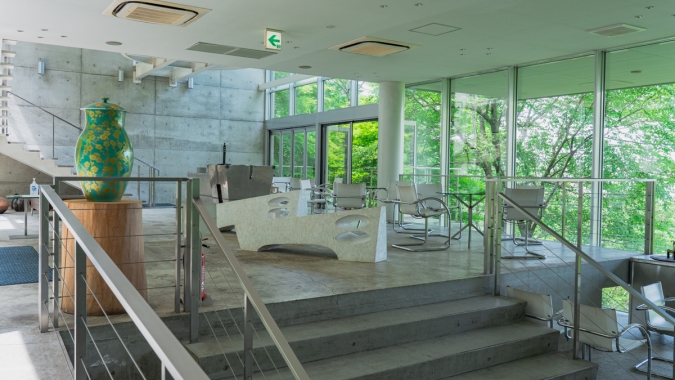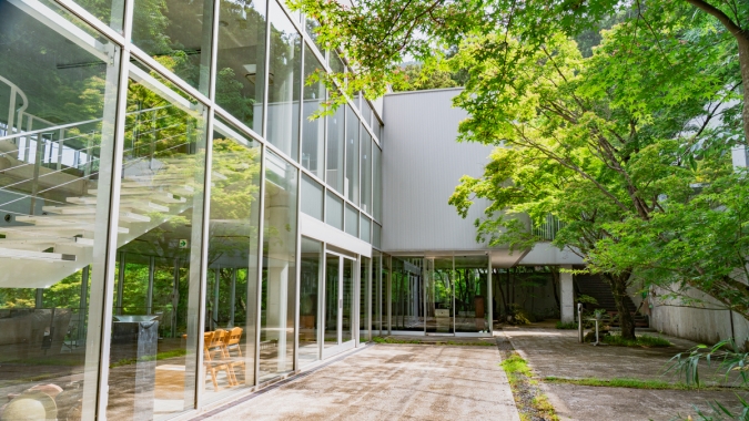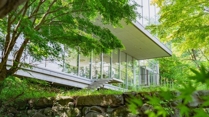 モダンで端正なガラス張りの建物が森の中から浮かび上がります。