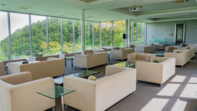 階段を上がった先に広がる2階席は、ゆったりとしたソファに座って雄大な自然のパノラマを一望できる特等席。