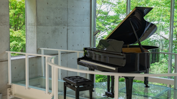 階段近くにはグランドピアノが浮かぶように佇んでいて、土日の18時以降にはピアノの生演奏を聴くことができるようです(ミュージックチャージ500円あり)。
