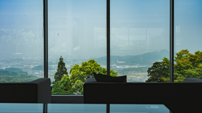 大きく切り取られた窓の向こうに広がるのは、福岡の街並みや山々、そして『博多湾』を望む、心洗われるような景色。