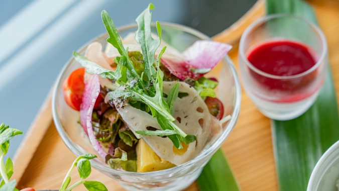 この日のサラダは、みずみずしい野菜やフルーツが彩り豊かに盛り付けられた『生ハムとホウレン草のサラダ』。
