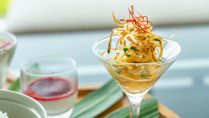 コシのある低糖麺にパリッと揚がった新ごぼうの食感が楽しい、軽やかで上品なメニュー。あっさりとした和風ソースは余韻まで心地よく、最後の一滴まで飲み干したくなります。