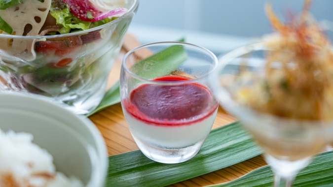 『お口直しの杏仁とうふ』は、とろけるような杏仁豆腐と甘酸っぱい有機いちごソースが重なる、気品漂う一品。