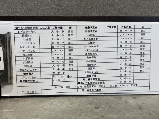 ご飯の大盛り、おかわりは110円。卵は+110円で高級ブランド卵『蘭王』に変更できます。