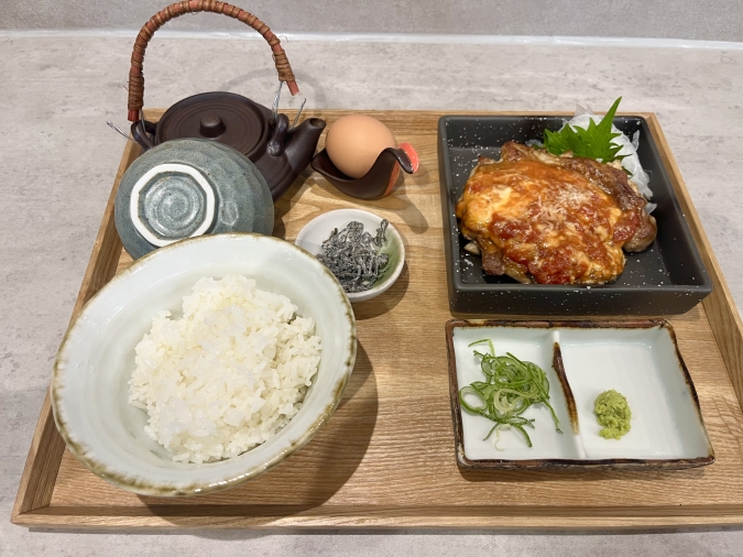 こちらは『鶏の一枚焼き定食(トマトチーズ)』(1,320円)。生卵は+110円で『蘭王』に変更しました。
