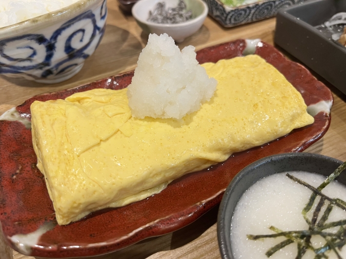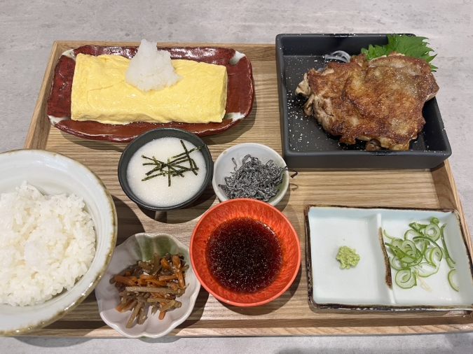 こちらは、『鶏の一枚焼きとだし巻き定食』(1,430円)。まるっと1本のだし巻き、鶏の一枚焼き、釜で炊いたご飯、ワサビ、ネギ、塩昆布、とろろ、小鉢がセットになっています。