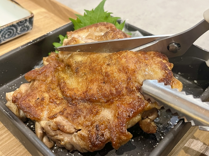 皮がパリッと香ばしく焼かれた鶏の一枚焼きは、専用のハサミでカットして食べるスタイル。