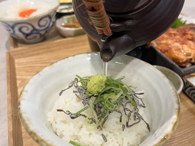 ごはんをおかわりして、〆は薬味をのせて出汁をかけて、茶漬けにするのもおすすめ。 鶏の一枚焼きをのせたら、豪華な“鶏まぶし”として楽しめますよ。