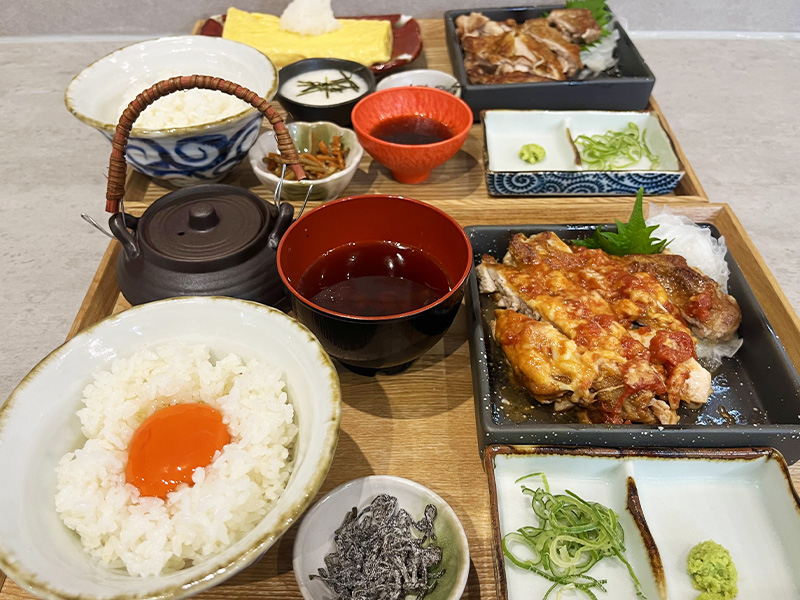 そのほか、13種類の味から選べる『鶏のから揚げ定食』(1,100円~1,320円)、『極徳卵かけめし』(550円)、『焼き鳥丼』(880円)、『唐揚げ丼』(880円)、『だし巻き卵定食』(880円)、『鶏の一枚焼きとだし巻き定食』(1,430円)が終日楽しめます。