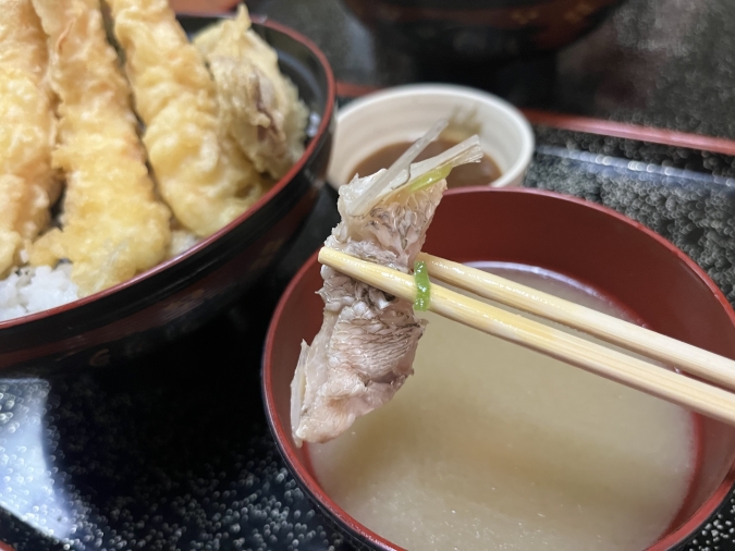 白身魚の出汁が効いたあら汁は、白味噌のやさしさに包まれるほっこりな一杯。がっつり天ぷらのリフレッシュにも最適です。