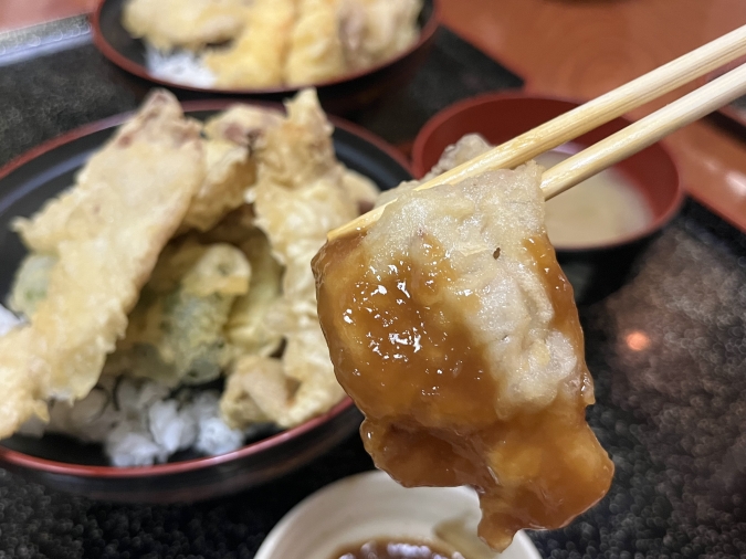 通常のつゆに天カスを加え、とろみを付けたタレなので、丼にかけるより、天ぷらをディップして食べるのがオススメ。