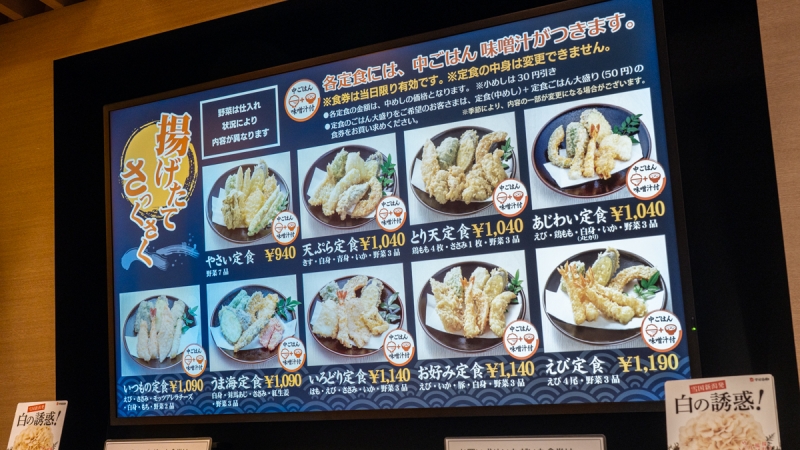 そのほかにも、4尾の海老が主役の『えび定食』(1,190円)や、変わりダネのもちとチーズの天ぷらが楽しめる『いつもの定食』(1,090円)など、魅力的な定食メニューが揃っています。