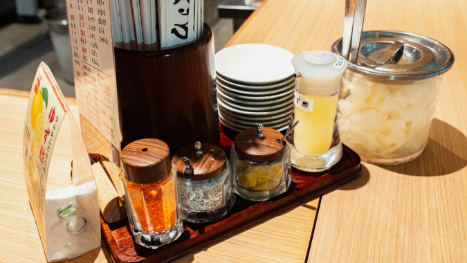 セットの天つゆのほか、卓上にごま塩、一味、柚子胡椒、ゆず酢、そして日替わりの漬物が用意されています。お好みで味変することで、違ったおいしさに出会うことができるのもうれしいところ。