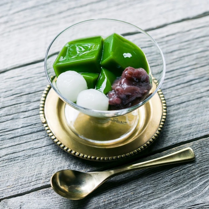甘さ控えめの小倉餡と、もちっとした白玉を添えた『生茶ゼリイ〔抹茶〕』。日本茶の味わいを、そのままつるんとなめらかに仕立てた一品です。繊細な茶の香りと芳醇でまったりとしたうま味をとじ込めています。