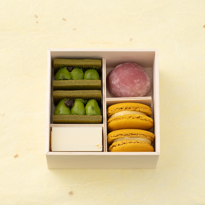 右上の甘酸っぱい「ラズベリー大福」と、左下のレモンジャムがアクセントの「バニラとレモンの羊羹」は和菓子。左上の「宇治抹茶のバターサンド」と、右下の「レモンのマカロン」は洋菓子。夏ならではの味わいが楽しめます。