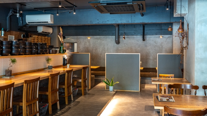 入り口近くのカウンターには、艶やかな萬古焼の土鍋がずらりと並び、店長の有吉さんが土鍋ご飯を丁寧に炊き上げる様子を、間近に眺めることができます。