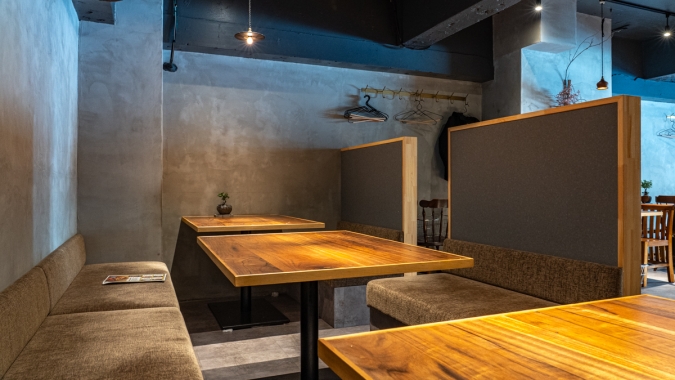 奥には仕切りのあるベンチソファー席もあり、家族連れやグループでも落ち着いて食事が楽しめます。