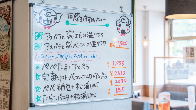 パスタは名物の『ぺぺたま。』(1,485円)を筆頭に、糸島から届くトマトの水分だけで仕上げた『完熟トマト・ベーコン・ニンニク』(2,090円)や、まかないから生まれた『ぺぺ納豆』(1,650円)など、個性豊かなメニューが盛りだくさん。