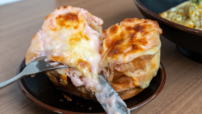 ほんのり甘くて香ばしいふわふわのトーストに、チーズの濃厚な旨味と明太子のマイルドな辛味がマッチした、リッチな味わいが魅力です。