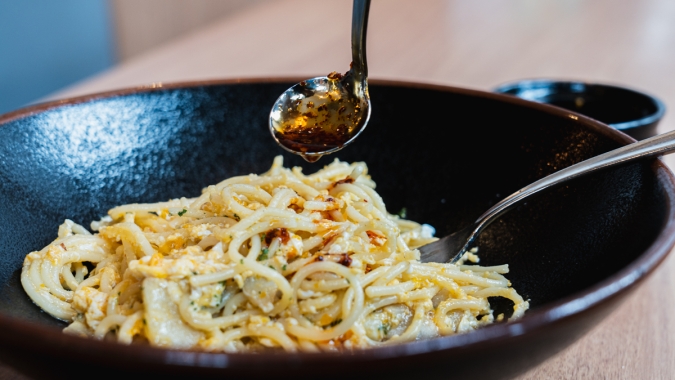 唐辛子オイルの香ばしい辛みにより奥行きが生まれ、最後の一口まで飽きることなく楽しめますよ。