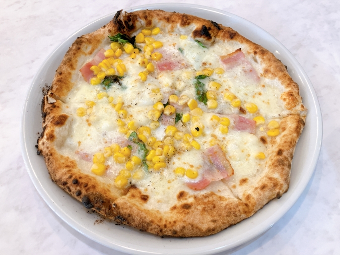 たっぷりのモッツァレラチーズに、コーン、ハム、生クリームがのった『マイス』(1,400円)。『マイス』はイタリア語で「とうもろこし」を意味します。