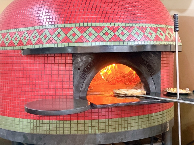 ピッツァは注文が入ってから生地を手で伸ばし、具材をのせて薪窯に投入! 焦げないように長いヘラを使って回しながら焼いていきます。