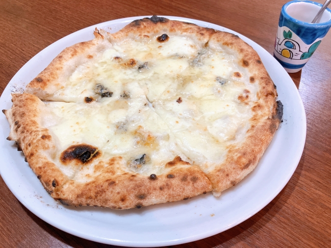 4種のチーズがのった『クワトロフォルマッジ』(1,800円)。別添えのメープルシロップをかけていただきます。