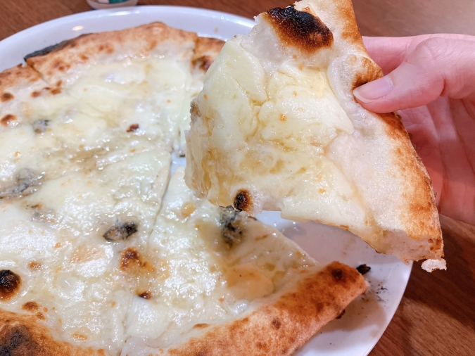 一口食べてそのおいしさに感動♡ 4種のとろ~りと伸びるチーズが溶け合った濃厚な味わいと、甘~いメープルシロップとが相性抜群で、甘じょっぱい風味がやみつきになるおいしさでした。