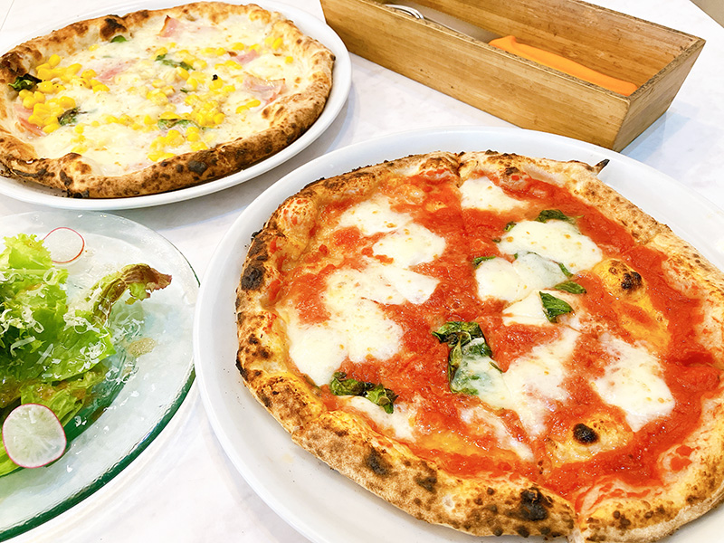 高温で焼いたピッツァは耳はカリッふわっ、中はもちっ!サラダ付きのランチセットがお得