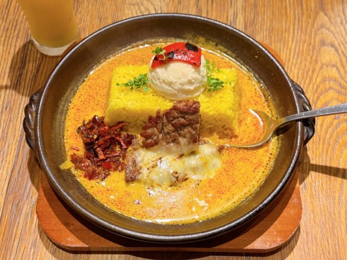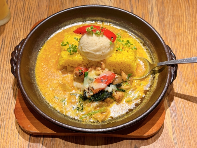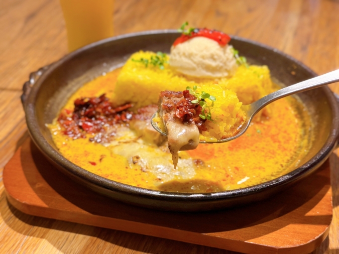 チーズ好きさんにぜひ食べてほしいのが、『チキンと焼きトマトチーズカレー』(1,300円)です。こちらはやさしい1辛でオーダーしてみました。