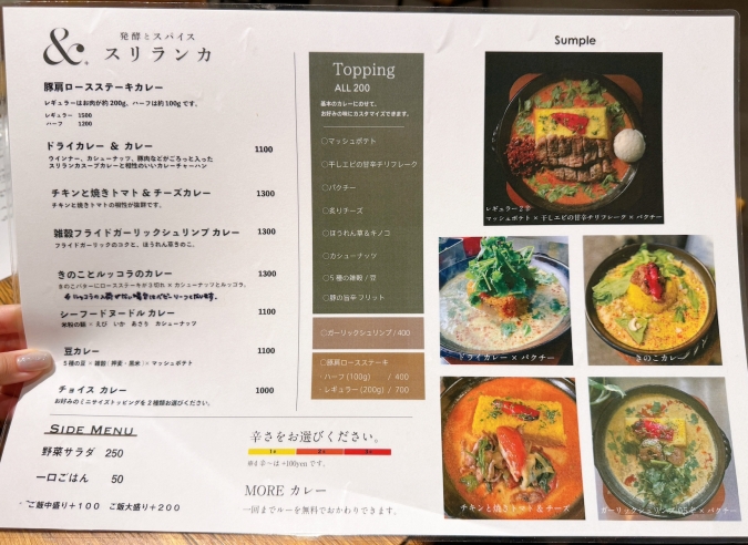 『&スリランカ』の楽しみ方のひとつでもある“トッピング”。私は「マッシュポテト」、「干しエビの甘辛チリフレーク」、「炙りチーズ」(各200円)を追加。 ちなみに、「炙りチーズ」が掛かっているので見えにくいのですが、