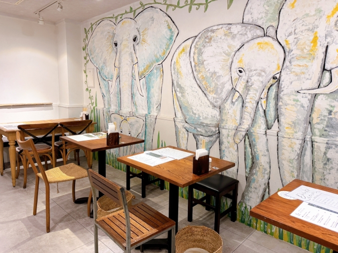 店内に足を踏み入れると、目を引くのは壁いっぱいに描かれたダイナミックな象のイラスト! 福岡で活躍するお笑い芸人・のぼせもん なべさんの作品で、空間にぬくもりとアートの彩りを添えています。