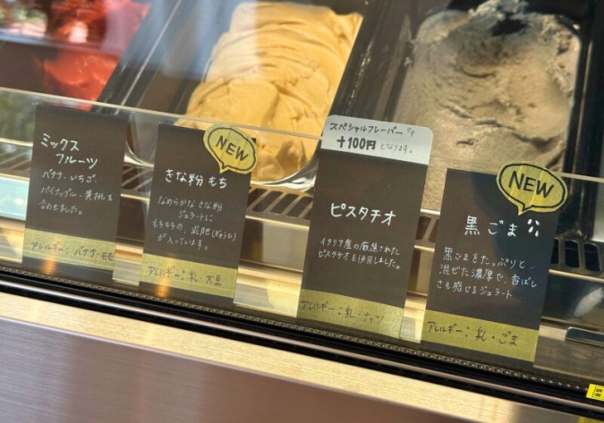 この日は、『ピスタチオ』(+100円)、『黒胡麻』、『きな粉もち』、『チョコレート』、『ほうじ茶』、『ミルク』、『ダブルベリーヨーグルト』、『ミックスフルーツ』、『筑後産あまおう』、『いちごのティラミス』(+100円)など、王道から変化球まで取り揃えられていて、目移り必至。