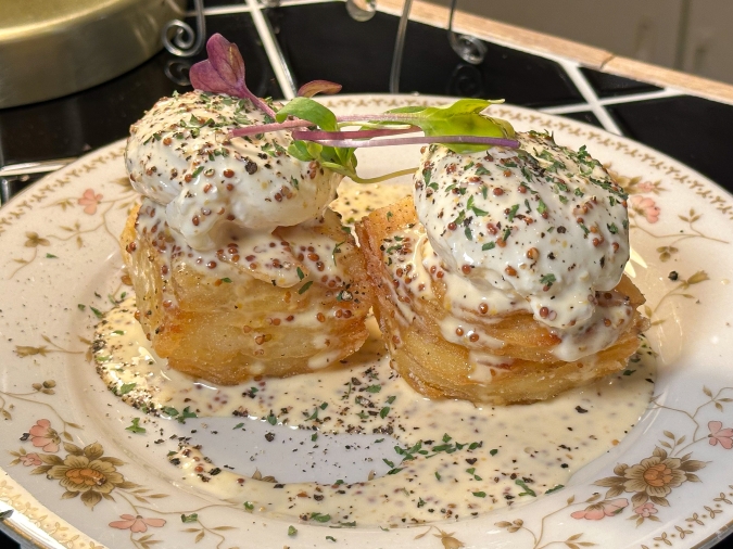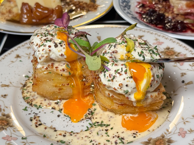 ニュージーランドで店主が暮らしていた地域では、お芋でエッグベネディクトを作っていたことから、さらにそれをアレンジ。薄くスライスしたお芋を10層のミルフィーユ状にして揚げて、ポーチドエッグと自家製ハニーマスタードソースがたっぷり合わせてあります。