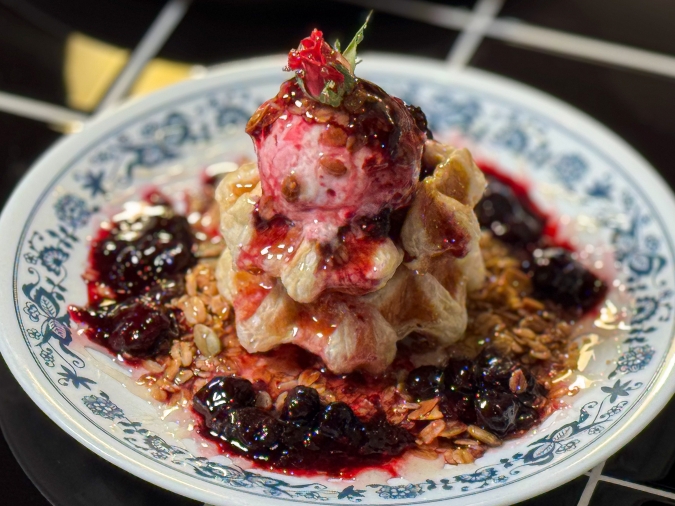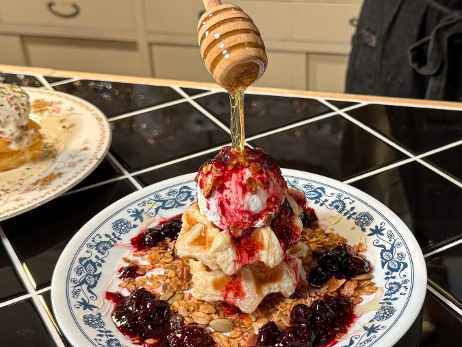 焼き立てクロッフルに、自家製グリークヨーグルト、自家製ブルーベリーソース、食品添加物不使用のグラノーラ、はちみつを合わせてあります。