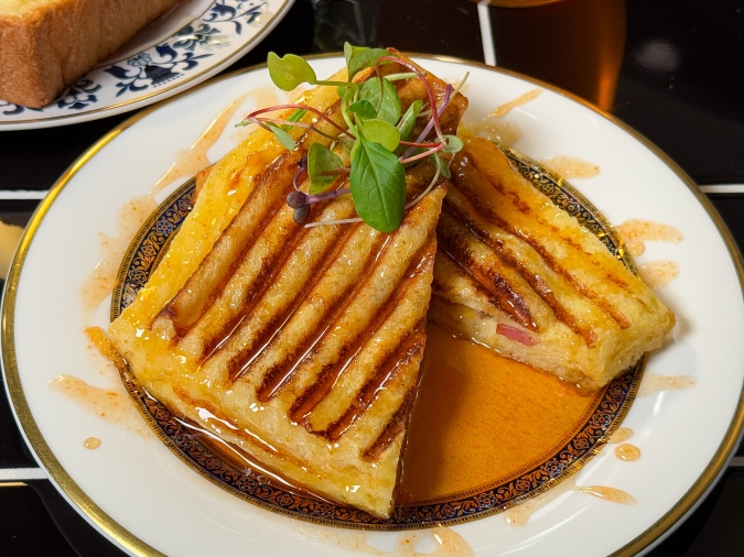 こちらは、『ホットハニーサンド(セットドリンク付き)』(1,600円)。卵液に漬け込んだトーストに、ベーコンと2種類のチーズをサンドして焼いてあります。仕上げにホットハニーがたっぷり。