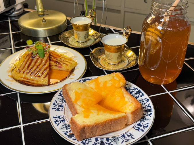 外はサクッ、中はトロッとしたフレンチトースト風のトーストとホットハニー。甘塩っぱくて、最高の組み合わせ!