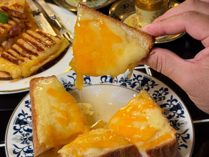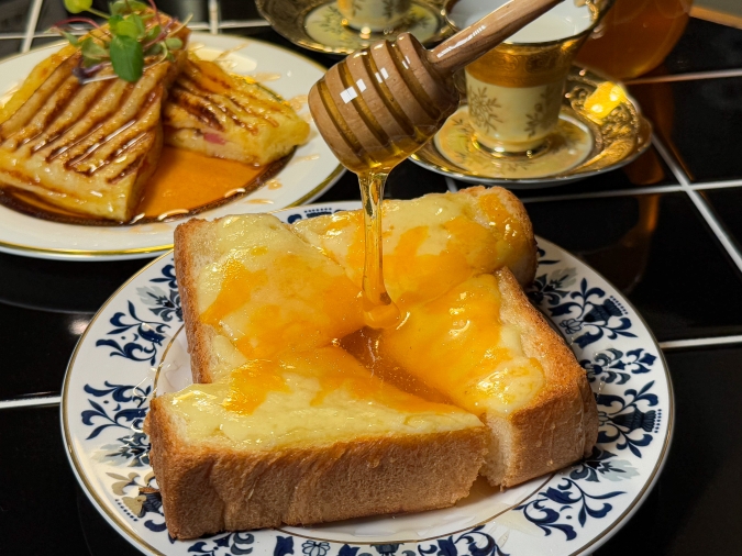 こちらは、『ハニーチーズトースト(セットドリンク付き)』(1,600円)。厚切りのトーストに2種類のチーズとはちみつが合わせてあります。