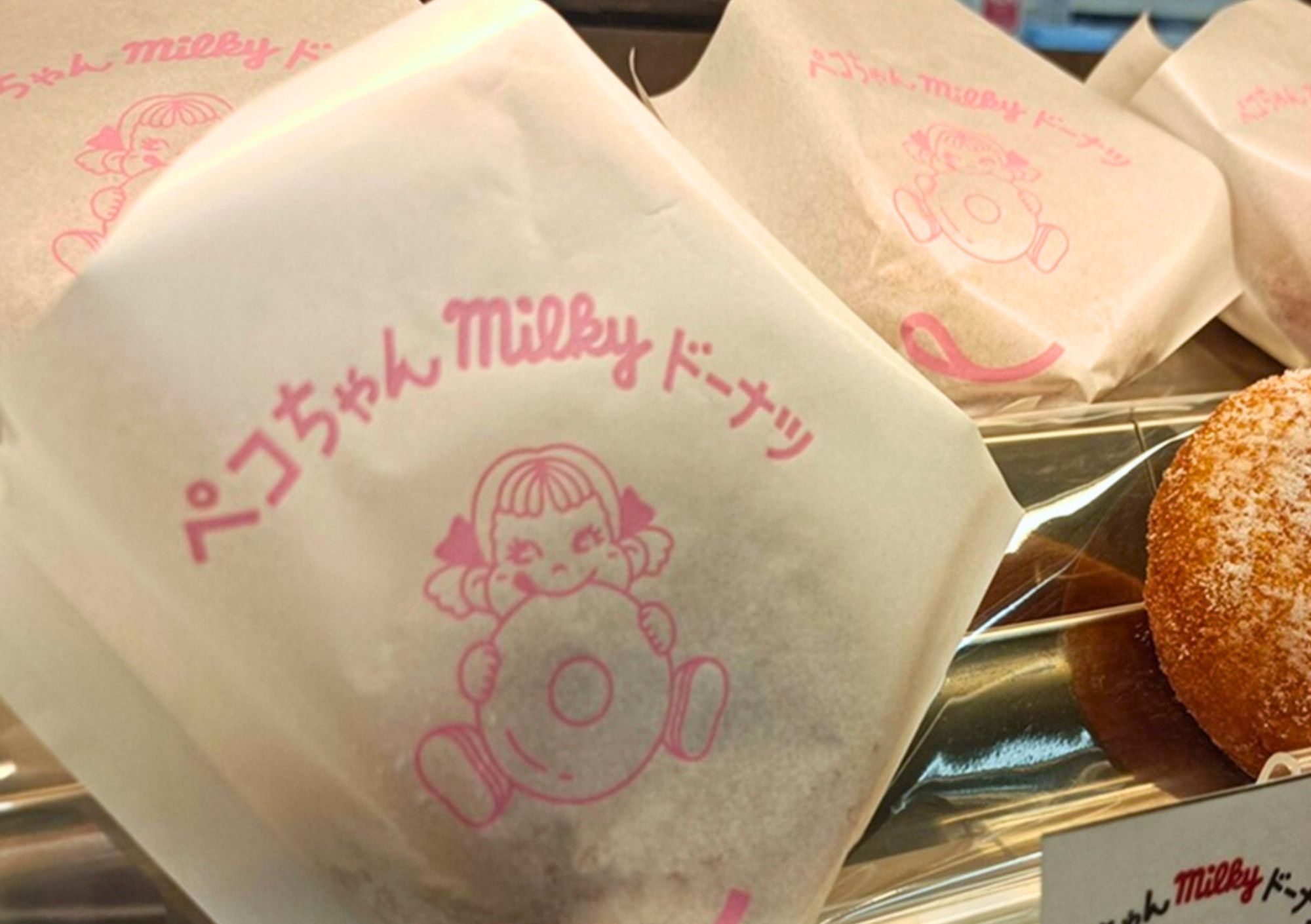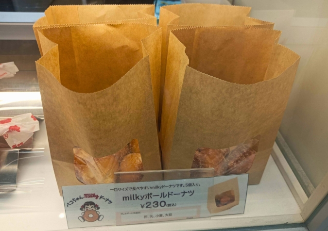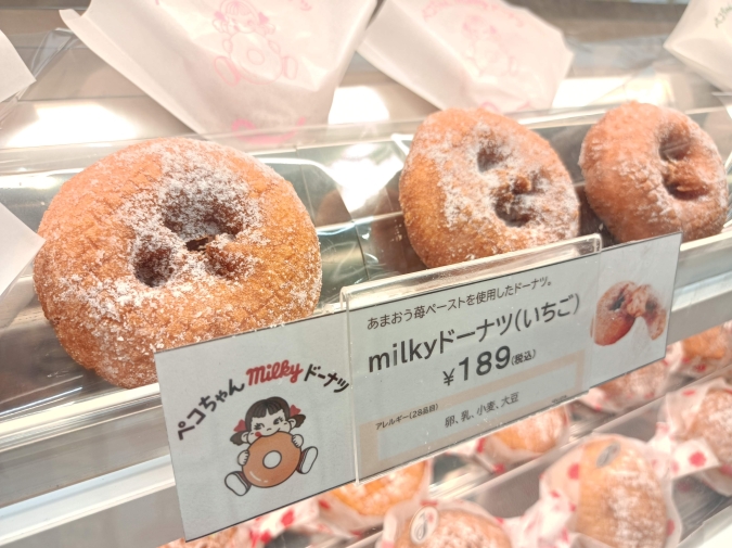 “ペコちゃんが作った夢のドーナツ屋さん”という『ペコちゃんmilkyドーナツ』。不二家のロングセラーキャンディ「ミルキー」のミルクの風味をイメージし、一つ一つ丁寧に米油で揚げた、軽いくちどけでやさしい味わいのドーナツが並びます。