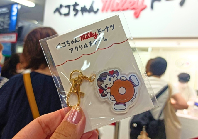 店頭にはグッズもあって、『ペコちゃん milky ドーナツ』ブランドロゴのイラストがチャームになった『ペコちゃんmilkyドーナツ アクリルチャーム』(550円)も。ぜひチェックしてくださいね。
