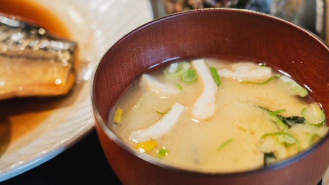 いりこ出汁の味噌汁は、柚子の皮がアクセントとなり、味噌の甘みを感じつつもさっぱりと楽しむことができます。