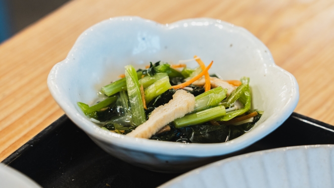 この日の小鉢は小松菜、にんじん、えのき、油揚げの和えもの。