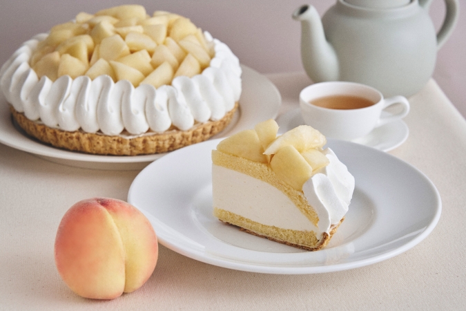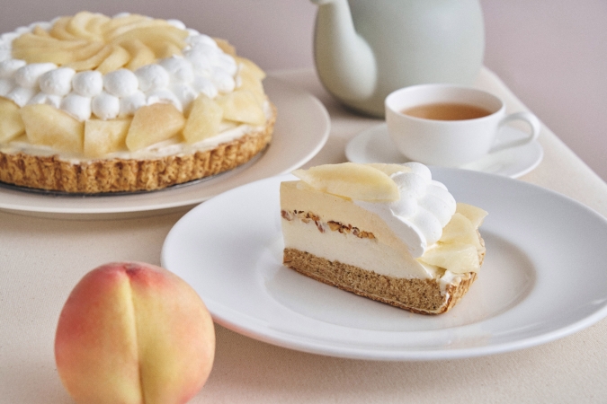 2025年8月6日(水)~9月2日(火)に提供される『白桃とアールグレイのムースケーキパイ』(1,430円)はちょっぴり大人なケーキ。アールグレイとの掛け合わせで、より一層桃の上品な甘さがひきたちます。