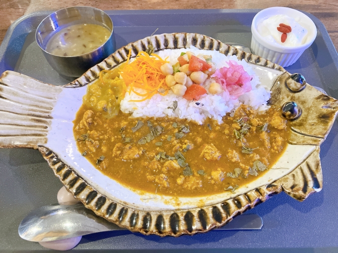 カレイのお皿がとってもかわいい♡ 『330monkey』の特徴でもあるこのお皿は、大分県日出町の特産である“城下かれい”をモチーフにしたもの。「カレイのお皿でカレーを華麗に食す」ということで、日出焼藤原窯で、師匠の今朝利氏に習って1枚1枚手作りした、こだわりのあるお皿だそう♪