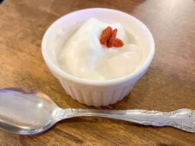 この日のミニデザートはクコの実がのった『杏仁豆腐』。なめらかな舌触りですっきりした味わい。カレーの後にピッタリです!