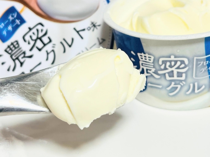 一口食べてみると、口の中でまったりととろけていきます。濃厚なミルクのコクがありながら、ヨーグルトならではの酸味も感じられ、ギリシャヨーグルトのような“濃い”味わい。一口目から、商品名の「濃密」という文字に激しく頷きました。