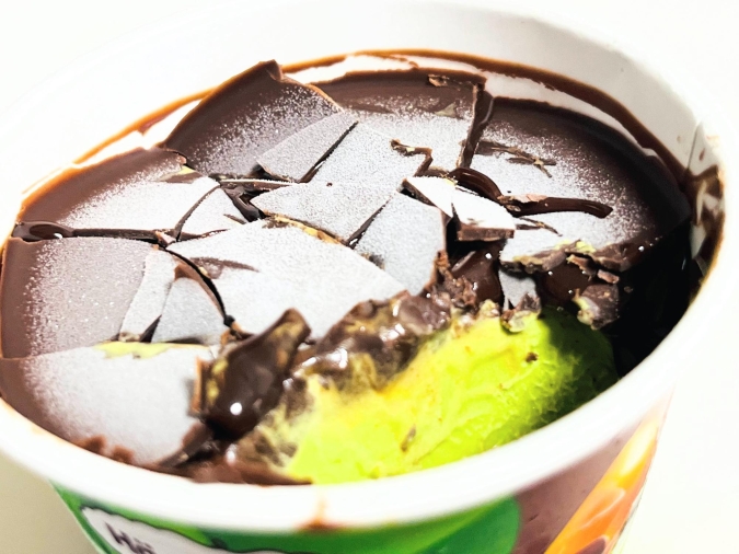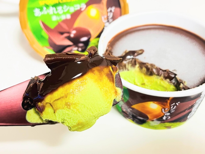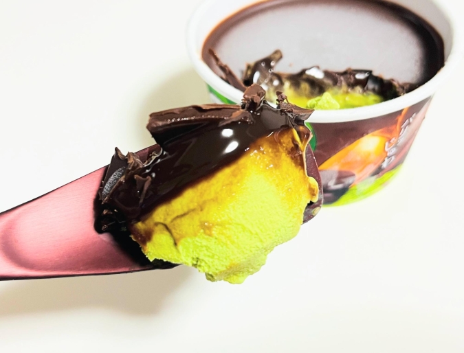 アイス部分は濃厚。バニラの甘い香りとコクが、チョコレートの酸味や深みと絶妙にマッチして、バランスの取れた味わいになっています。