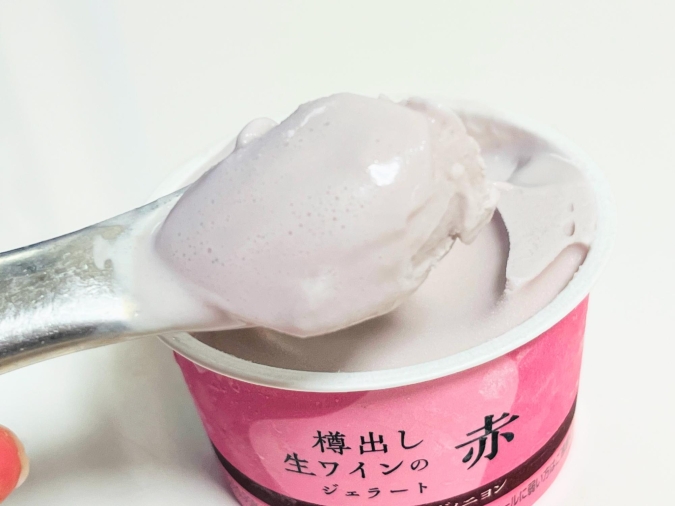 そしてスプーンを口に近づけると、ふわっと香るワインの香り。口に含むとなめらかにとろけて華やかな香りが広がり、まろやかな甘さが追いかけてきます。余韻には、アルコール感と深みのある風味がしっかりと残ります。
