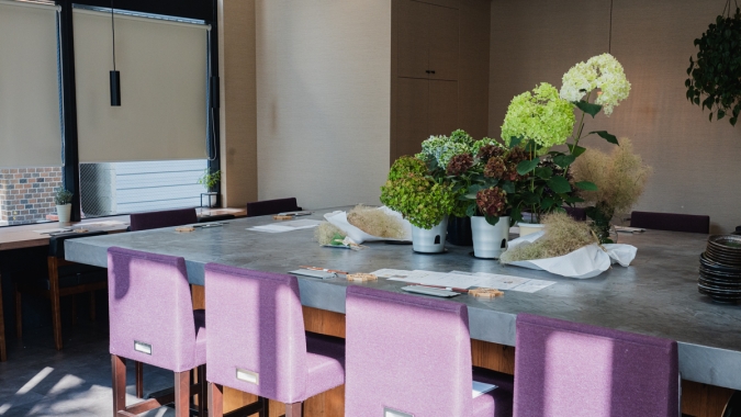 開放感あふれる窓から注ぐ光と、随所に配されたグリーンが調和した、上質でミニマルな空間です。